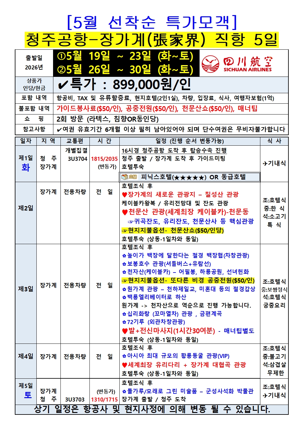 5월 청주-장가계 2회 특가모객